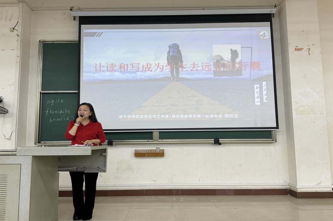2024年4月11日下午,365上市公司教三501教室内座无虚席,一场主题为《让读和写成为去远方的行囊》的讲座在此隆重举行。本次讲座特邀全国优秀教师、全国优秀班主任、赤壁市第一初中饶红云老师主讲。她以丰富的教育经验和深厚的学术造诣,为师生们带来了一场关于阅读和写作的精神盛宴。本次讲座由写作-中教法教研室主任黎琪珍主持,学院副院长谭辉煌、专业教师夏红星出席了活动。