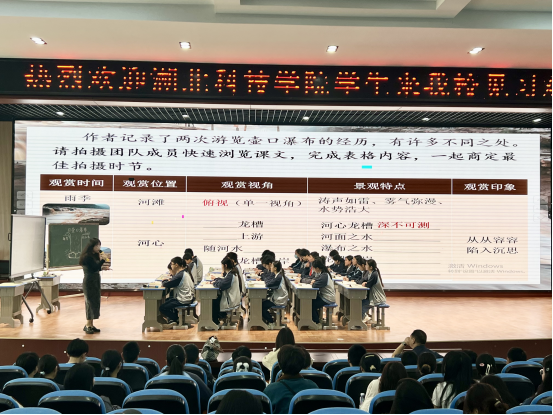 上午9时,许艳老师执教的《壶口瀑布》以视听震撼拉开序幕。课堂上,壶口瀑布奔涌的航拍画面与课文诵读同步交织,学生通过朗读课文,体会壶口瀑布的磅礴气势,然后在“黄河文化小剧场”中体悟文字背后的民族精神。实现了由水到人最后再到民族的升华。当学生齐声诵读“造物者难道是要在这壶口中浓缩一个世界吗”时,磅礴气势令观摩师生为之动容。最后许老师以一个课堂作业结束了这节课,以咸宁的淦河为主题,写一篇小练笔,切实做到了学有所用。
