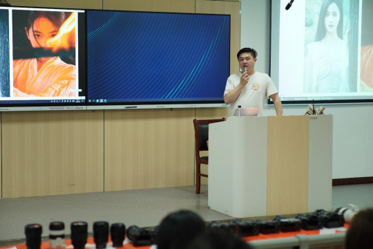 秦飞老师以“探寻青春的印记”为题切入人像摄影实操。他提炼出“情绪为核、外形为基、背景为衬”三大拍摄要诀,现场手把手演示如何通过调整模特眼神与微调下巴角度来提升画面质感。针对同学们“背景太乱”的通病,秦飞详细拆解了大光圈虚化与创意外观滤镜的机内设置,内容干货满满,引来不少同学低头做笔记。
