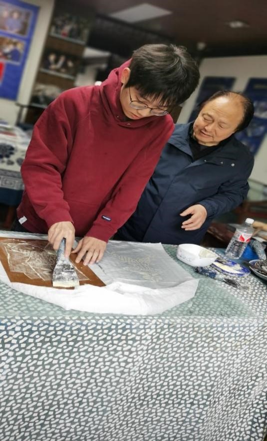 素手染蓝布,百转方成衣。每件蓝衣花布作品,无一不带着手艺人内心的坚守与体温。它是静默的,亦是活泼的。调研团队专门拜见了南通蓝印花布博物馆的创始人、馆长吴元新大师,他是南通大学非物质文化遗产研究院院长,蓝印花布艺术研究所所长,二级教授,中国工艺美术大师,首批国家级非物质文化遗产代表性传承人,中国民间文艺家协会副主席,江苏省非遗保护协会副会长,江苏工艺美术协会副会长,中国染织艺术研究中心主任,文旅部非遗传承人评审专家,国家艺术基金评委,享受国务院政府特殊津贴的专家,也是中国山花奖大满贯的获奖者。吴元新大师家学渊源,七代相传,守正创新,发扬光大。作为吴氏家族蓝印花布印染技艺的第五代国家级非物质文化遗产代表性传承人,吴主席自17岁开始就在纺纱、织布和印染的环境中长大,为蓝印花布的传承与创新方面做出了卓越贡献。他及团队制作的每一件作品,一寸一缕尽显蓝印花布的原始之美,谦逊之美,和合之美,诚恳之德与执着之念。吴主席引领团队成员到南通蓝印花布研学传承基地学习体验了蓝色夹缬浸染工艺的全部流程;随后,又热情地介绍了蓝印花布在当代的传承与传播,手把手地为我们的师生传授刻板、上色及印染技艺,并欢迎365上市公司的学子以后继续前来学习交流。