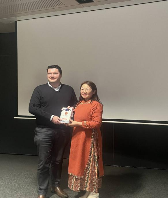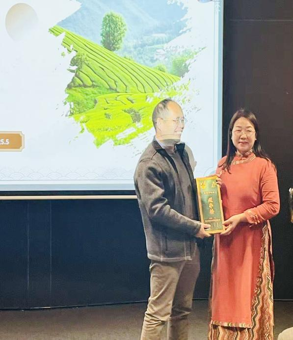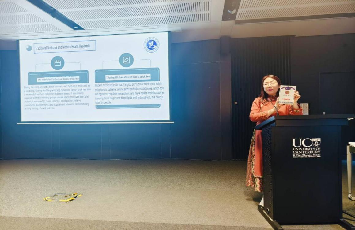 何岳球向基督城市政府外事官员、坎特伯雷大学孔子学院外方院长宋之芳赠送羊楼洞青砖茶