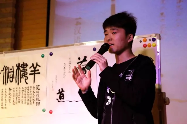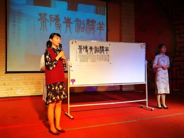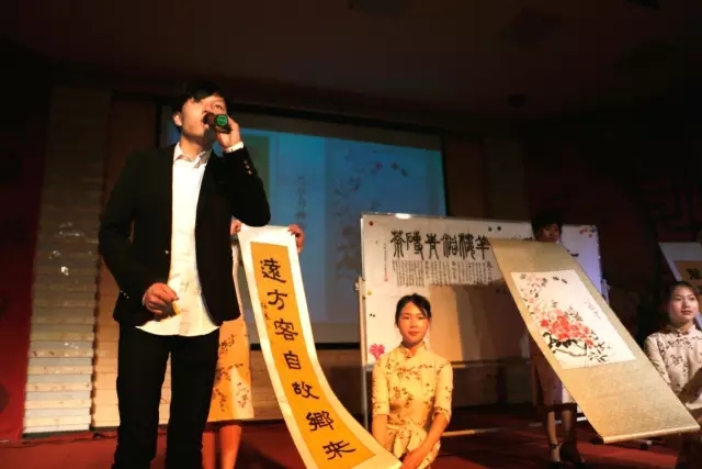 经历了手工艺品的熏陶,观众们又进入了诗歌带来的茶之意境中。诗朗诵《茶路上》《古茶》结束后,接着展示的是我校学生创作的优秀三行诗作品。“水壶在炉子上吵架,叶子在沸水里烫的嗷嗷叫,我在香气里迷失。”这是我院16级汉语言专业黄黎文同学的作品《玩儿》,“柴米油盐酱醋茶,这些本是俗事。我写的十分具有烟火气息,就是希望喝茶能重新普及到我们的生活中,重归柴米油盐的行列。”郭副院长在点评时夸赞道:“喝茶本就应当是生活中的常事,这些三行诗体现了茶与生活之间的张力,品味茶与生活的紧密,也不失为一种情趣,茶不仅可以品尝,还可以在字画中领略茶韵。”