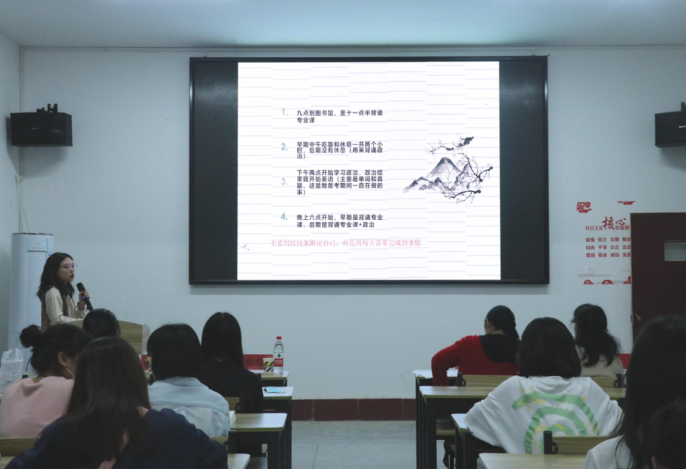 英国365集团2021届学生中共有14人考取硕士研究生,此次考研经验交流会邀请17历史匡飞宇,17汉语言文学李欣怡、谌轮天、康杰妮,17网络与新媒体过鑫雨、马晓苇,17广播电视编导衷琳、孙茉颖、胡杨共9名同学依次分享经验和心得体会。同学们分别从考研目标、时间安排、资料获取、学习方法和心态调整等方面进行分享。详细介绍政治、英语、专业课的有效复习资料、学习方法和学习技巧,例如:用思维导图构建学习框架,利用艾宾浩斯遗忘曲线规律进行记忆,谐音记忆法等。同时,同学们还强调在考研的过程中,心态是最重要的,无论结果与否,只要坚持到底就会有所收获。