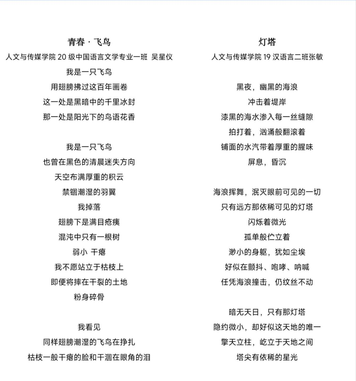 从百年团史故事到个体青春故事,来自全校13个院部三百余名学生以精致细腻的文字,真挚饱满的情感展现着湖科青年蓬勃向上的青春风采。吴星仪和张敏运用天马行空的想象,将鲜红的信仰比作灯塔,将迷茫的自我比作飞鸟,以内敛含蓄的语言述说着他们的爱团、爱党、爱国情怀,回顾百年光辉历程,展望未来新时代,紧跟党组织步伐,奋进新的征程。也有选手分享自己与共青团的难忘经历和感受,高仕婧回忆党课培训时的义卖活动,她在团组织带领下帮助他人、传递温暖,同时学习到了身为团员的责任与义务,受益匪浅、意义深刻。刘红讲述了自己跟随青马班到荆州洪湖、黄冈红安学习的经历。学党史,唱红歌,参观红色革命基地,一口不太熟练的红安话,道不尽的是红色革命精神。历史川流不息,精神代代相传,新时代的青年,青春正当时,奋斗正当时!
