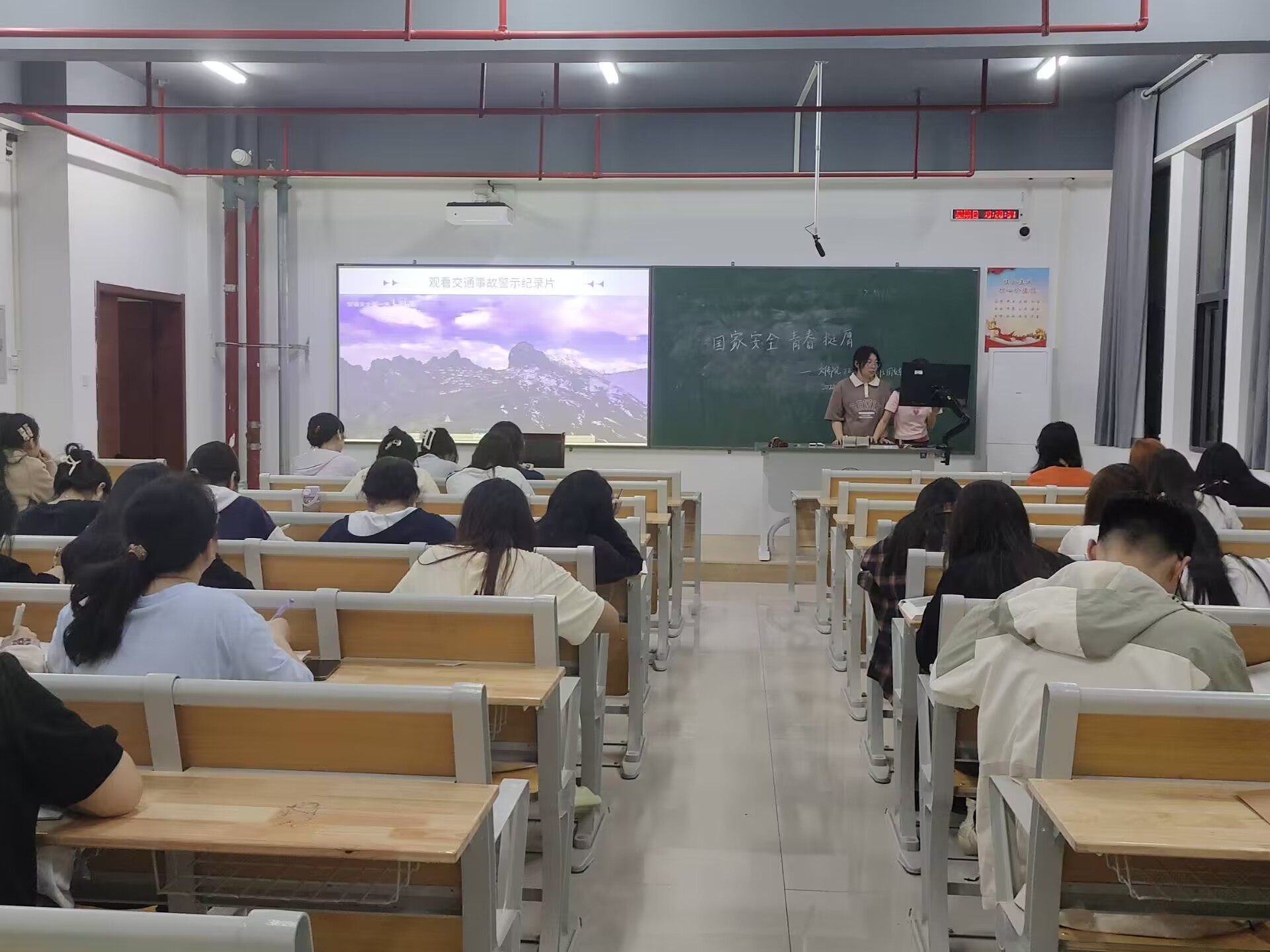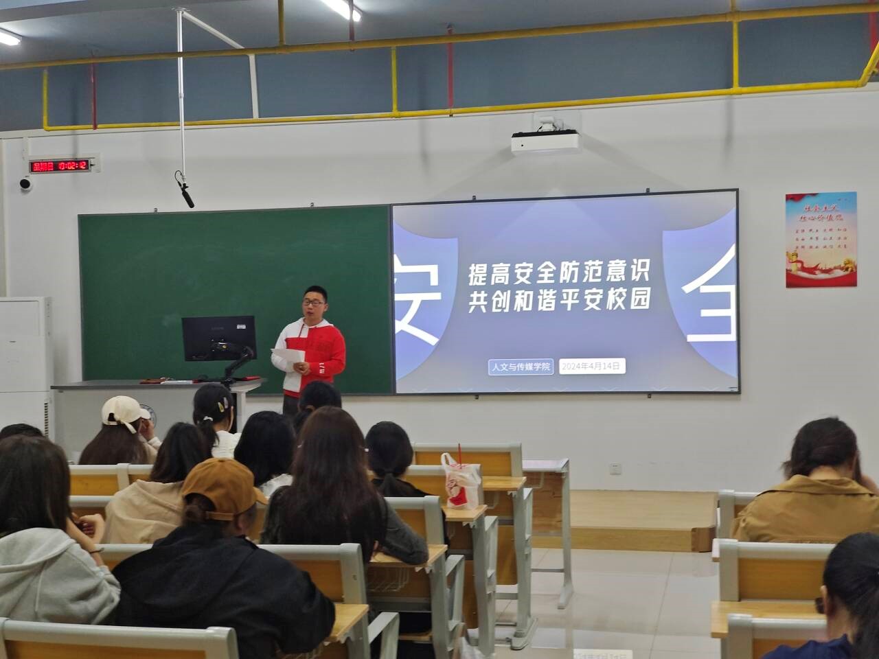 在第九个全民国家安全教育日来临之际,为强化校园交通安全与意识形态安全教育。2024年4月14日,我院各班在集中考评教室开展了以“提升安全防范意识,共创和谐平安校园”为主题的班会。班会由各班班主任主持,全体学生参与班会。