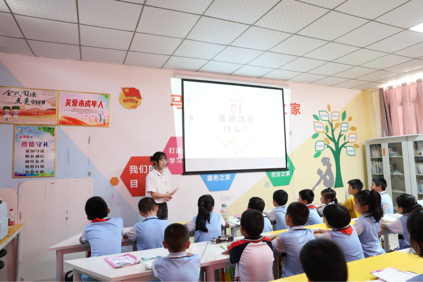 正音筑梦团队大学生宣讲员为马港镇的小朋友们做推广普通话的宣讲活动。通过讲述历史故事、普通话的来源、纠正常错读音、方言动画等形式,通俗易懂地让孩子们对普通话有了正确的认识与理解,加深了孩子们对推广普通话重要性的认识,同时还强调了“推广普通话并不意味着丢弃方言,方言保护也是十分重要的”。