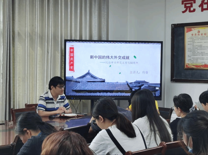 文史专业教师支部书记丹睿同志做《中国共产党的伟大外交成就——纪念中日邦交正常化50周年》专题党课,丹睿同志从日本投降的历史、中日关系的症结、中日的邦交三个方面展开深入浅出的讲解,为支部党员树立正确外交观,正确看待中日外交关系奠定了良好的基础。