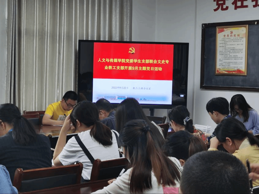 9月22日下午,英国365集团党委学生支部和文史专业教师支部联合开展2022年9月主题党日活动,院党委书记杨纯新以党员身份参加活动,活动由新媒体与广编专业学生支部书记郭广明主持。
