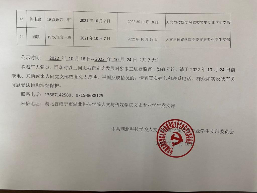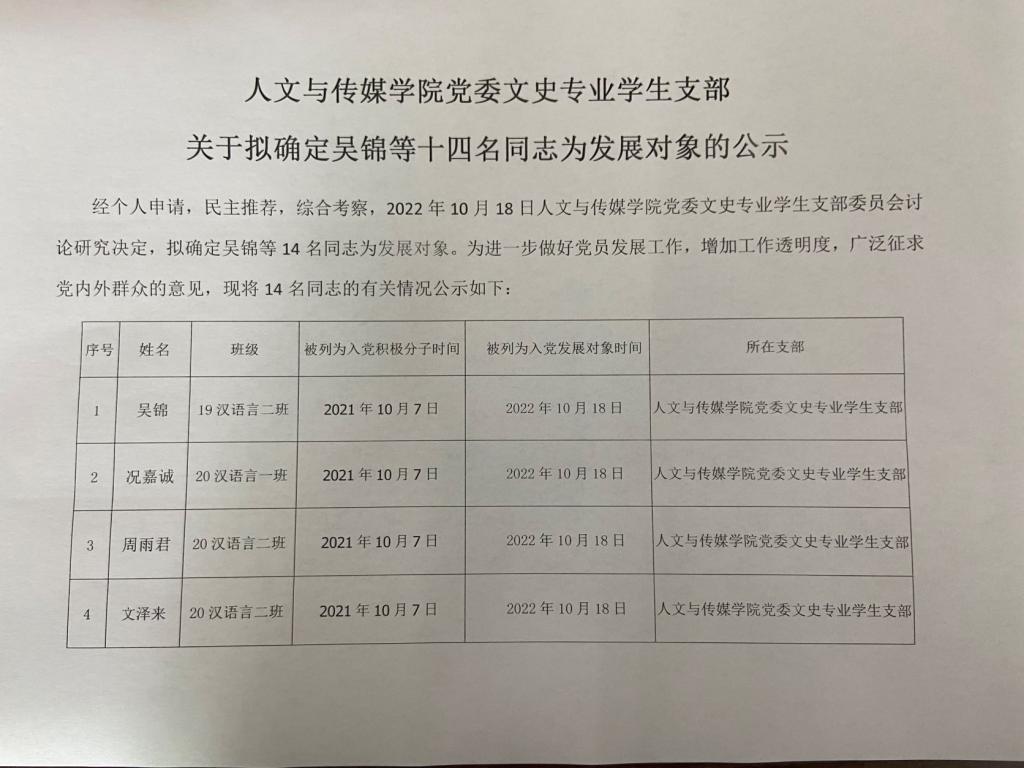 英国365集团党委文史专业学生支部关于拟确定吴锦等十四名同志为发展对象的公示