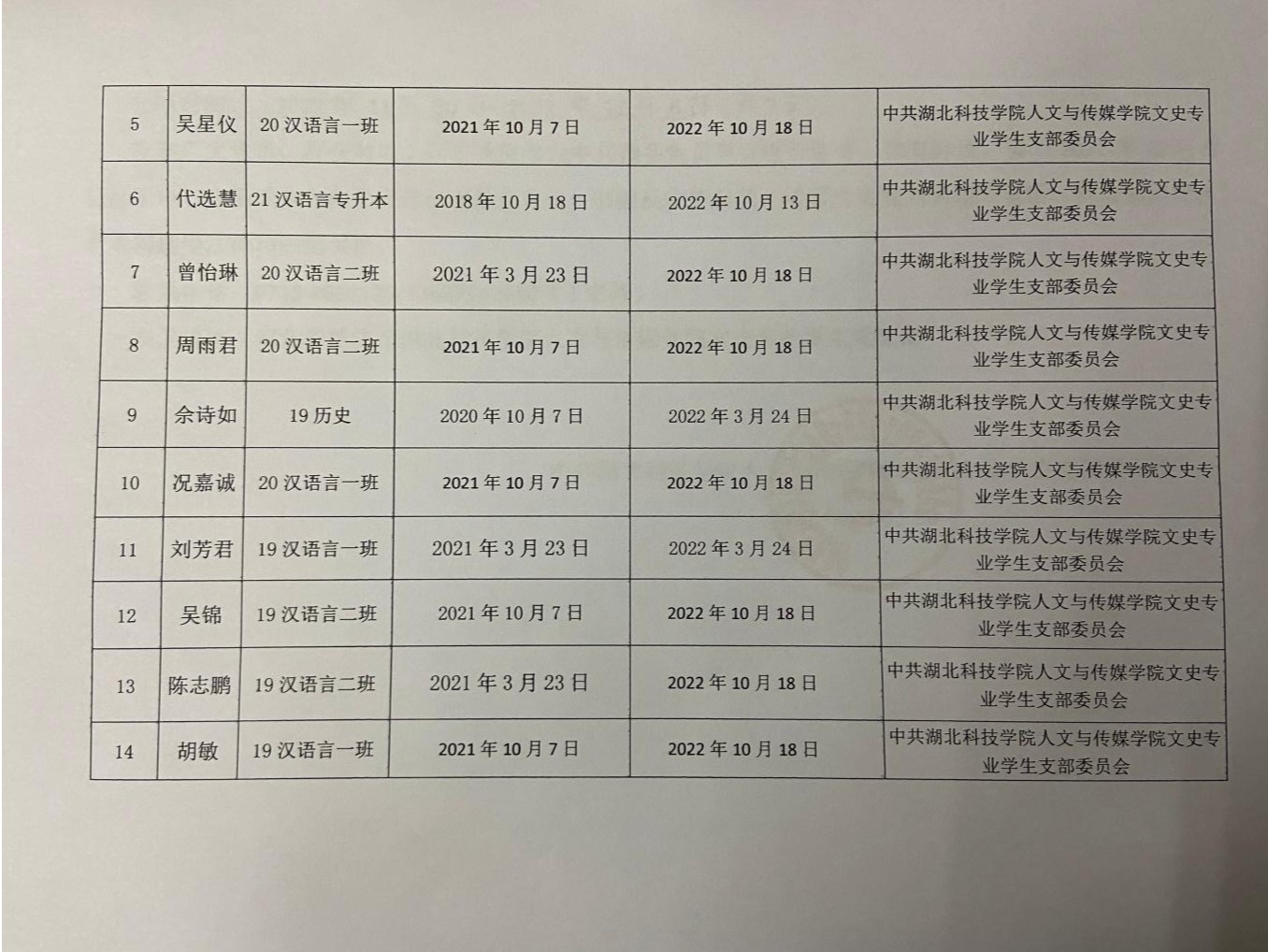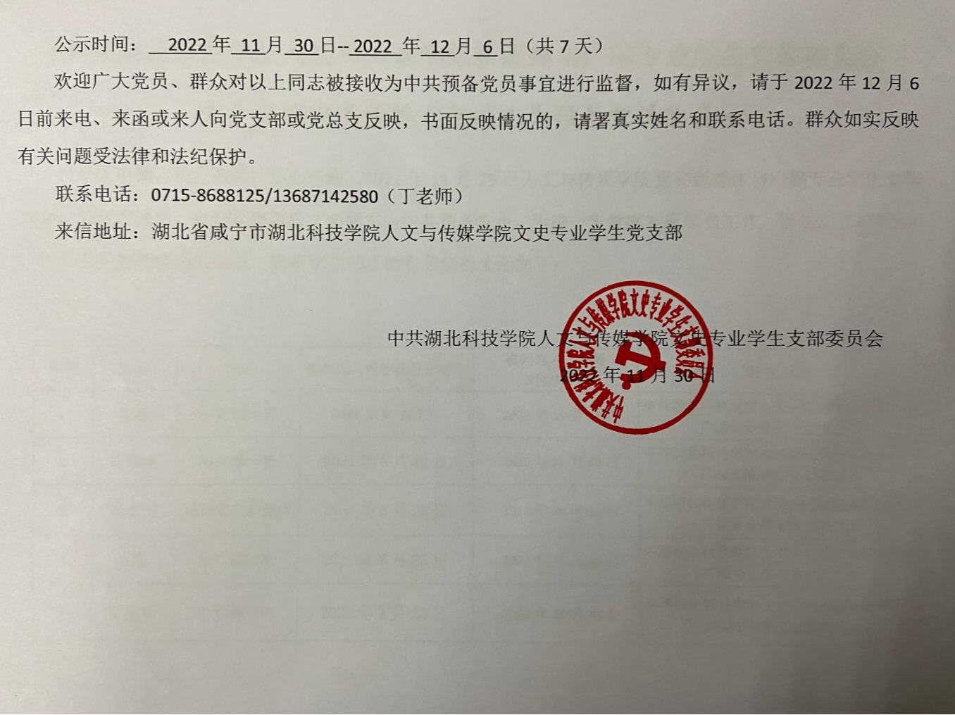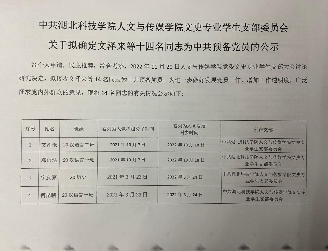 中共英国365集团文史专业学生支部委员会关于拟确定文泽来等十四名同志为中共预备党员的公示