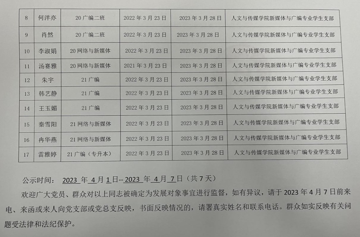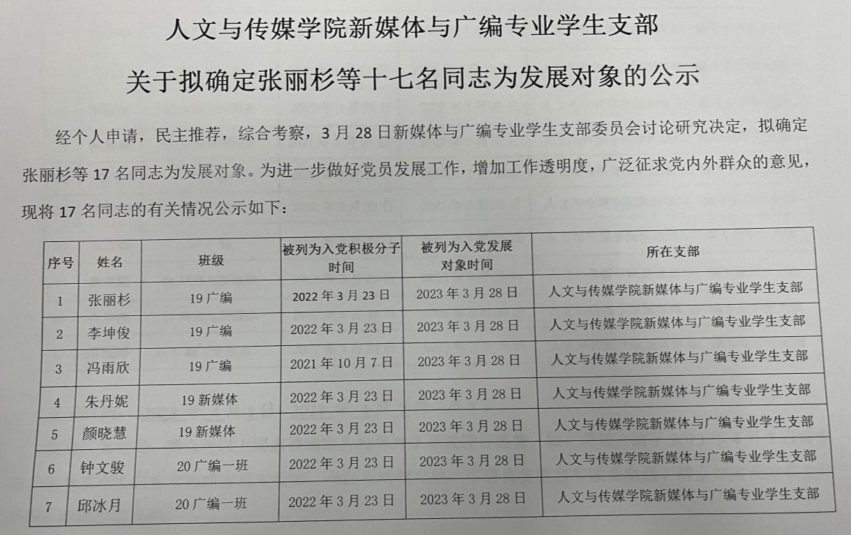 英国365集团党委新媒体与广编专业学生支部关于拟确定张丽杉等十七名同志为发展对象的公示