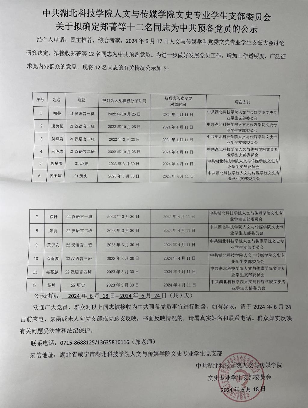 英国365集团党委文史专业学生支部关于拟确定郑菁等十二名同志为中共预备党员的公示