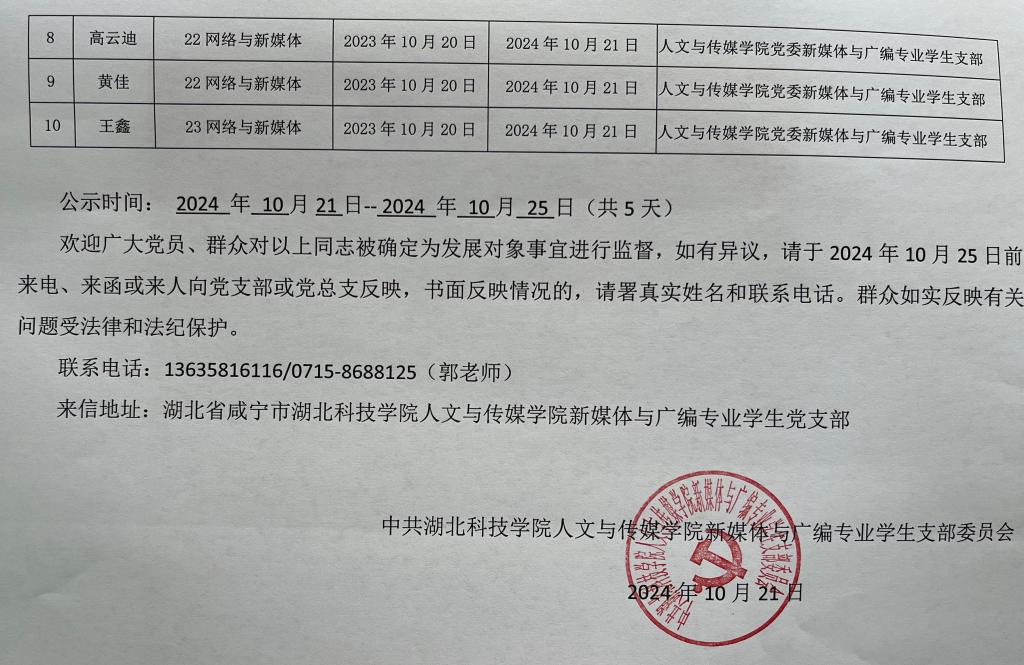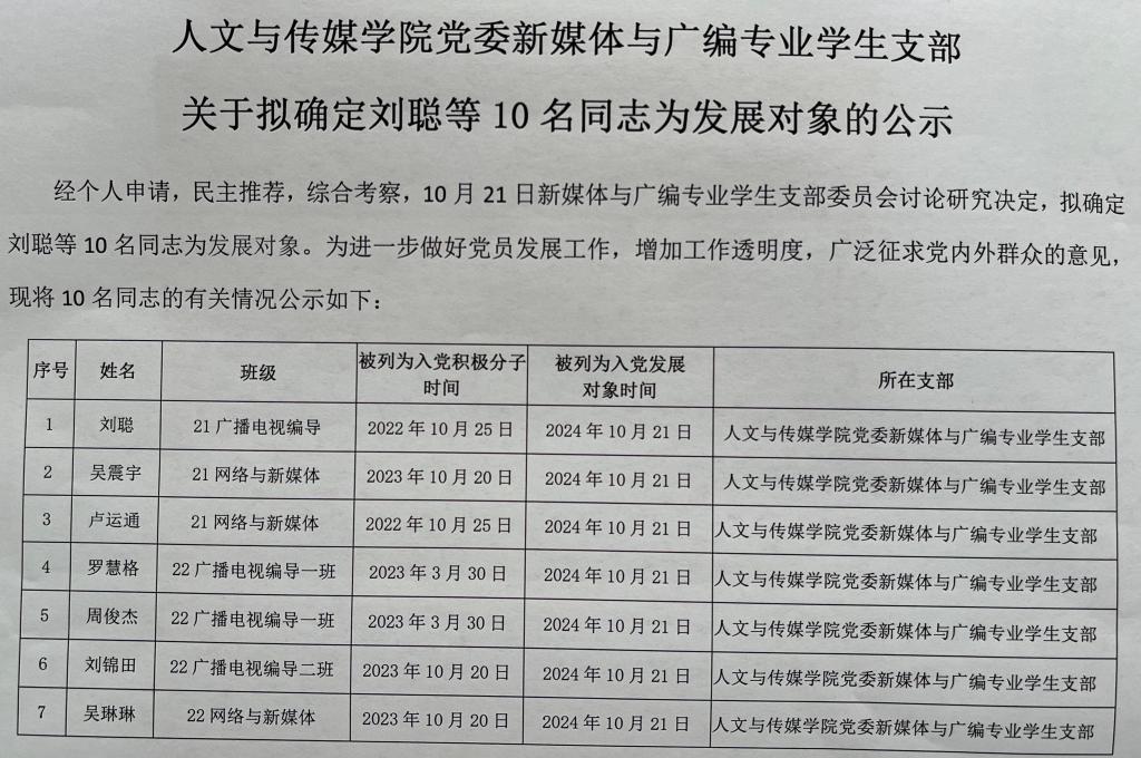英国365集团党委新媒体与广编专业学生支部关于拟确定刘聪等10名同志为发展对象的公示