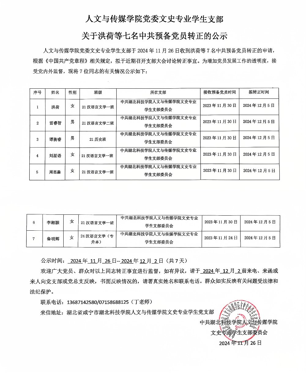 英国365集团党委文史专业学生支部关于洪荷等七名中共预备党员转正的公示