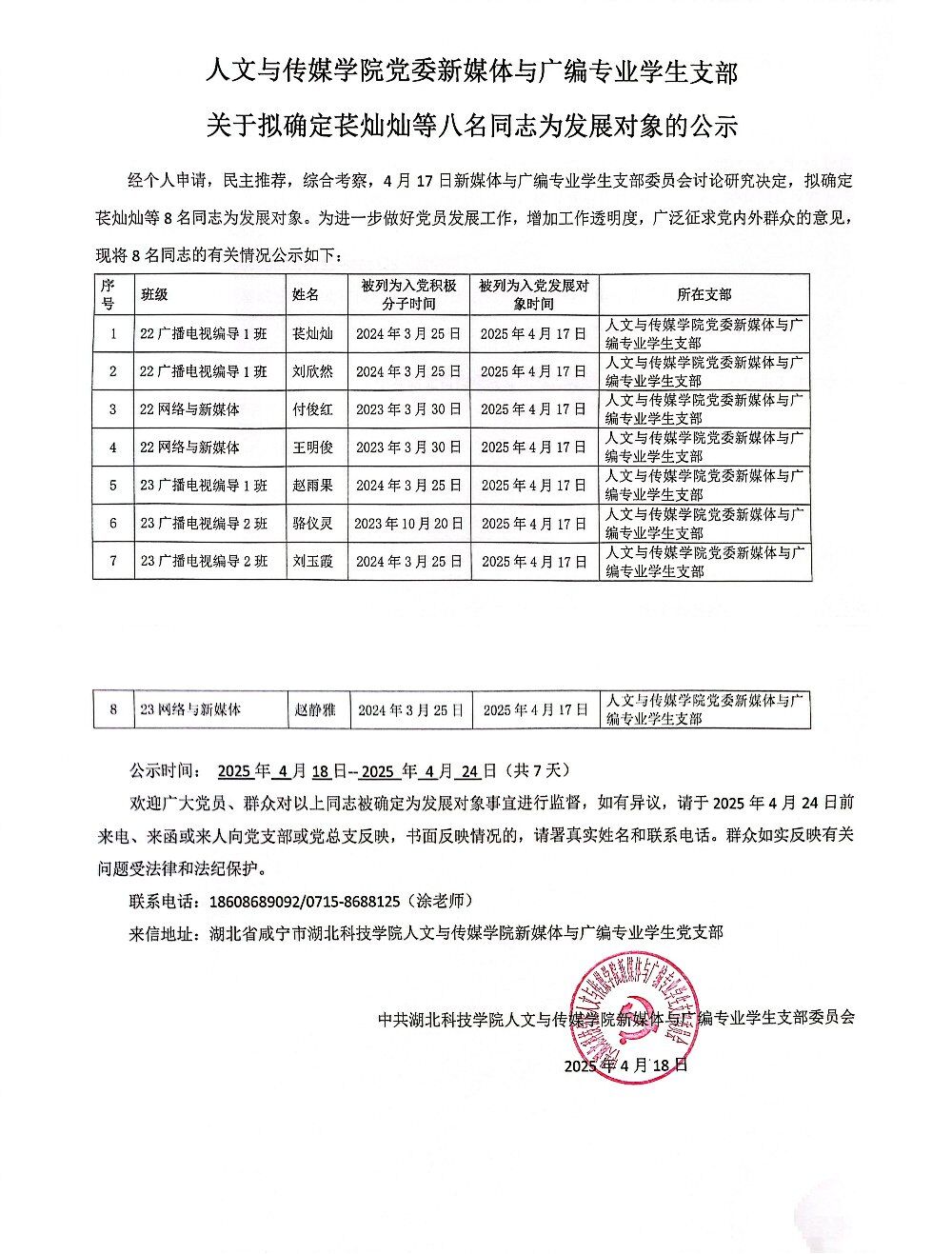 英国365集团党委新媒体与广编专业学生支部关于拟确定苌灿灿等八名同志为发展对象的公示