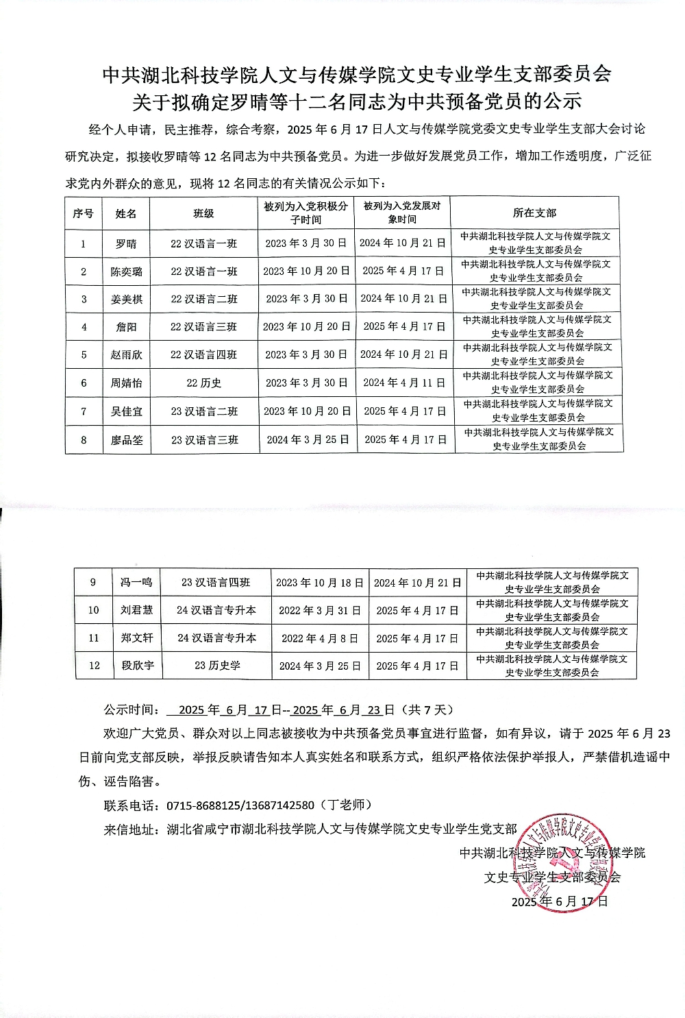 英国365集团党委文史专业学生支部关于拟确定罗晴等十二名同志为中共预备党员的公示