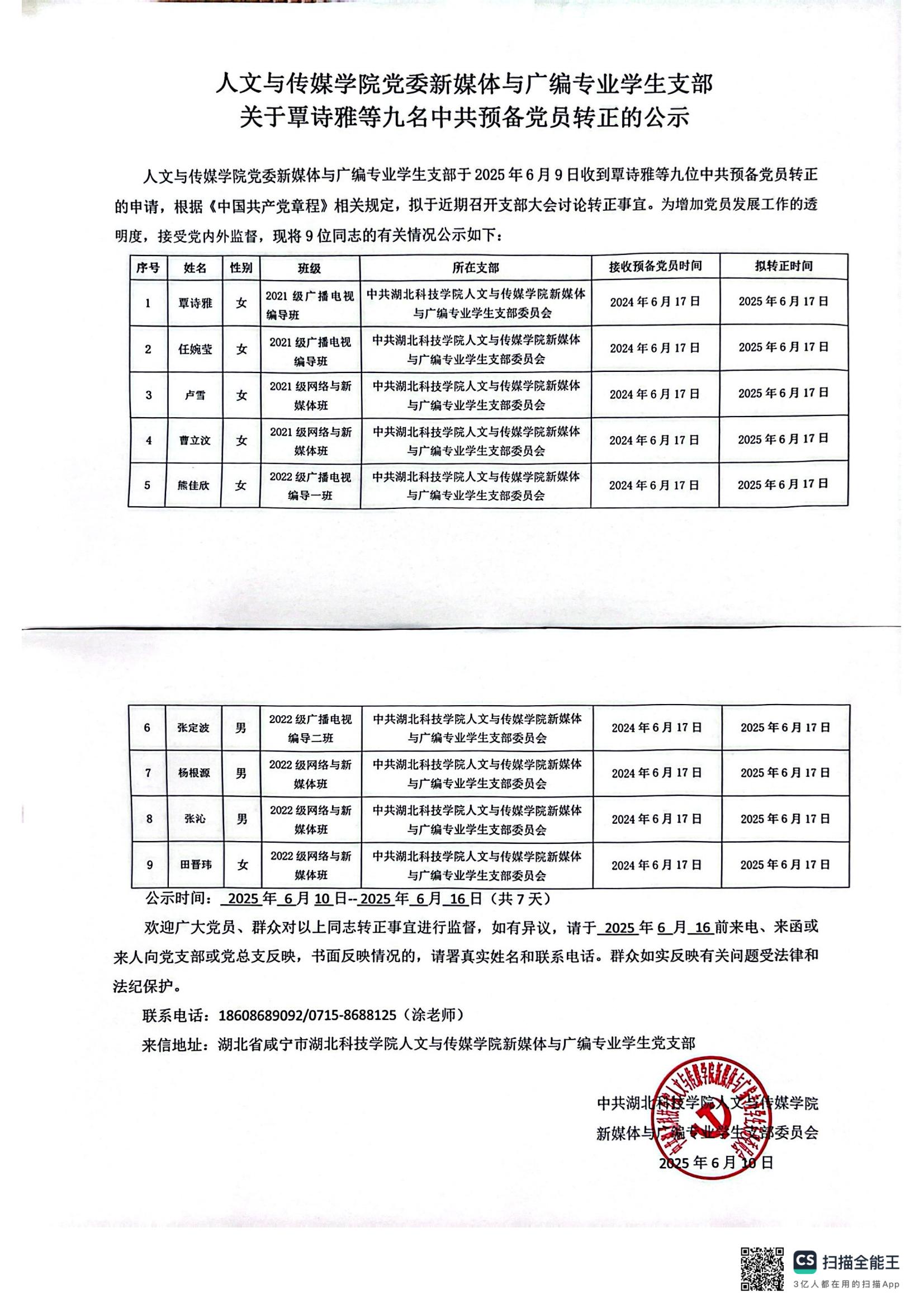 英国365集团党委新媒体与广编专业学生支部 关于覃诗雅等九名中共预备党员转正的公示