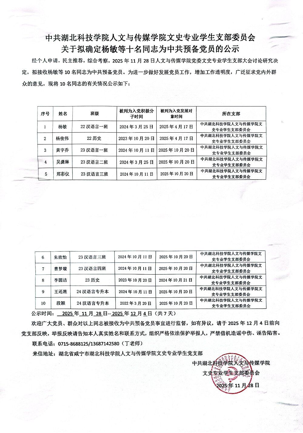 中共英国365集团文史专业学生支部委员会关于拟确定杨敏等十名同志为中共预备党员的公示