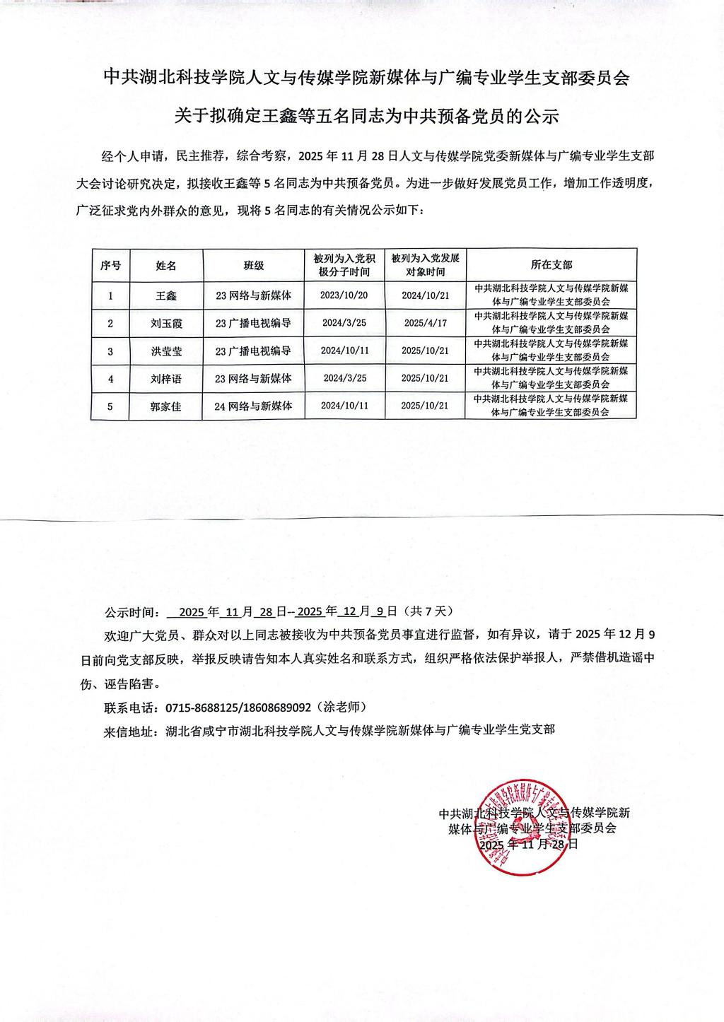 中共英国365集团新媒体与广编专业学生支部委员会关于拟确定王鑫等五名同志为中共预备党员的公示