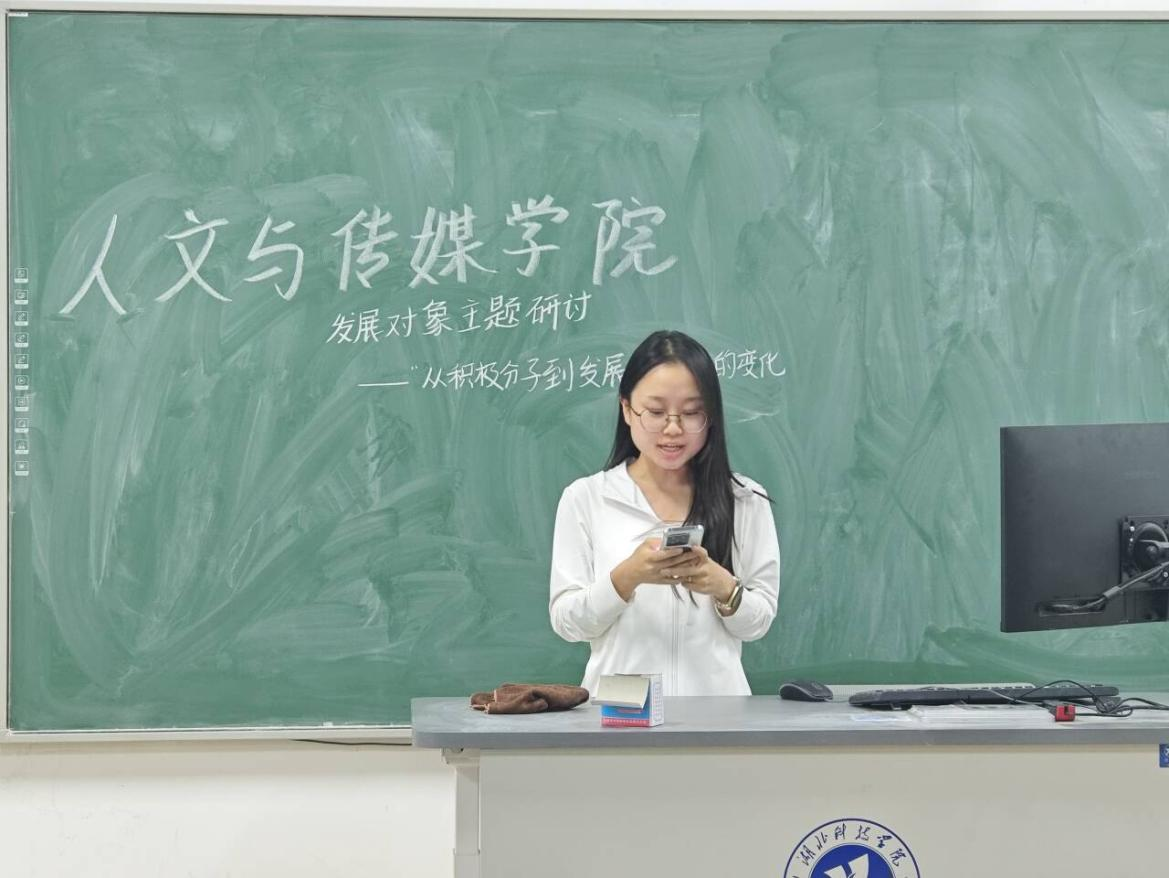 研讨会上,2023级广播电视编导专业骆仪灵同学以“在平凡小事中沉淀信仰”为题,回顾了自己从提交入党申请书到成为发展对象的心路历程。“成为积极分子后,我开始主动学习党的理论,思考如何用专业能力服务集体。”她以参与校园短片拍摄、社区反诈宣传等实践为例,坦言“责任感不是别人给的,而是自己主动扛起来的决心”。其发言引发共鸣,有同学感慨:“为人民服务不是口号,是藏在每一次‘多做一些’的选择里。”充分展现了当代大学生在党的培养下,思想认识不断深化、政治觉悟持续提升的良好态势,彰显了青年学子从“向往”到“担当”奋进足迹。