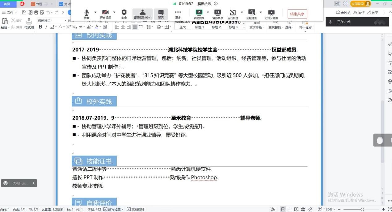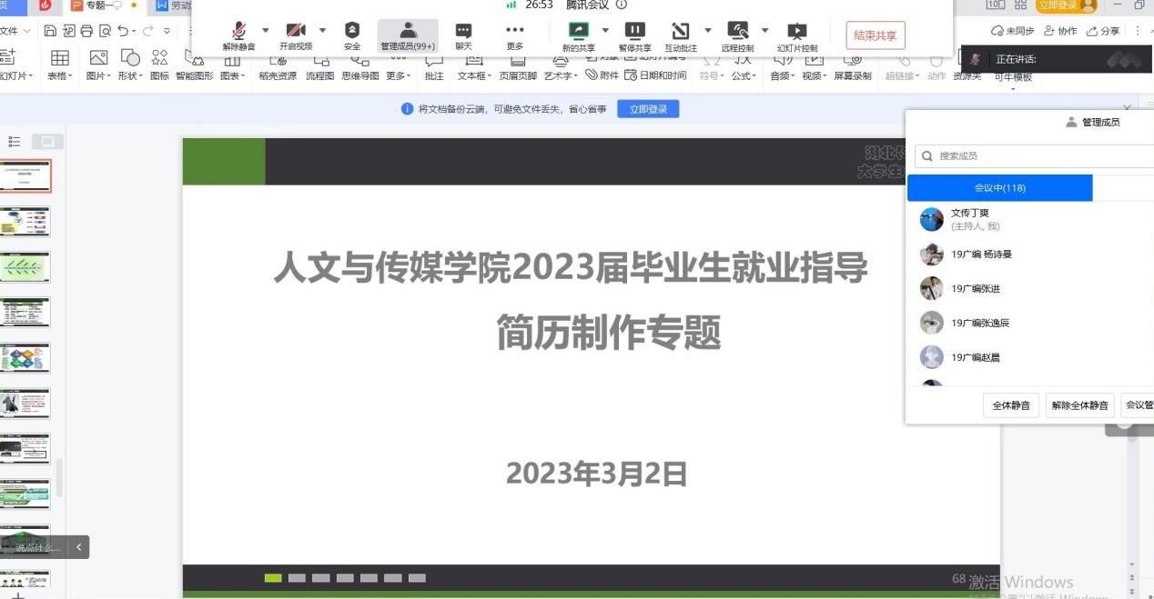 为增强我院毕业生简历制作能力,提高求职成功率,2023年3月2日,我院通过腾讯会议开展2023届毕业生简历制作专题指导会议,为2023届毕业生提供制作简历的指导。由辅导员丁爽主持,百余名毕业生参加。