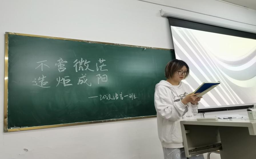 会上品读《湖科优秀学子风采录》,学习优秀学子精神。20级中国语言文学专业一班的汪文艺同学朗读分享了18级汉语言专业舒钗同学的文章。“有匪君子,切磋琢磨”“不忘初心,方得始终”“心之所向,无问西东”传递出了舒钗的学习态度和榜样精神。在品读学习完风采录后,两位同学分享了她们的学习心得。许欣芸同学说道:要向榜样们学习,努力钻研专业知识,多学多练,积极参加活动,全方面发展。赵睿灵同学则提到党员要发挥好先锋模范作用,敢于担当,勇于作为,争做优秀学子。