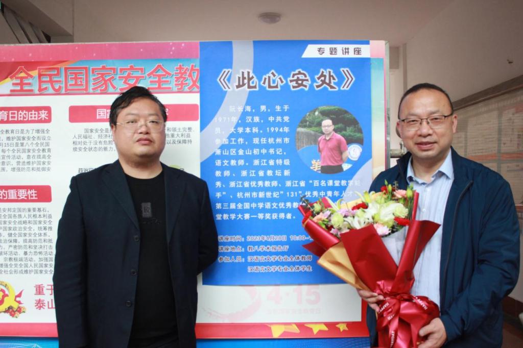4月28日上午,浙江省特级教师、杭州市萧山区金山初中书记阮长海受邀来到英国365集团为汉语言文学专业学生做了一场题为《此心安处》的讲座。英国365集团院长郭彧、汉语言文学专业负责人张磊出席本次活动。