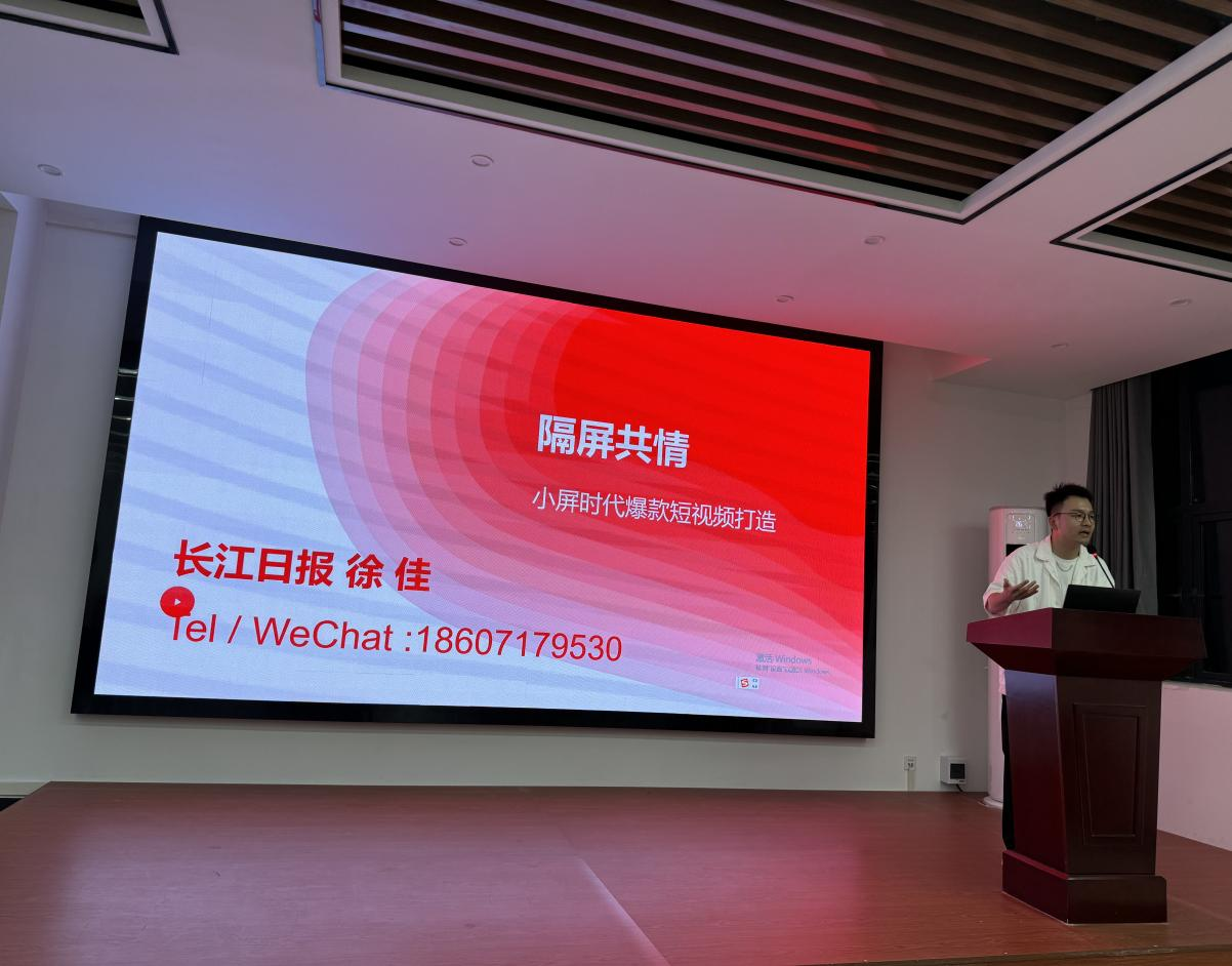 接着,徐佳结合自己在长江日报的工作经验,以“隔屏共情:小屏时代爆款短视频打造”为主题,针对“如何制作符合时代主旋律、观众喜闻乐见的短视频”展开了交流分享。最后,他让同学们提出自己感兴趣的问题,并做出细致回答,为同学们的就业方向和前景做出分析。