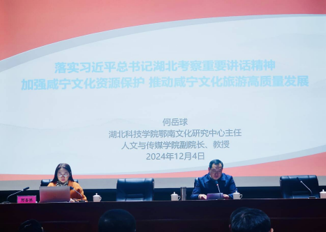 2024年12月4日,为深入学习贯彻习近平总书记考察湖北重要讲话精神,贯彻落实党的二十届三中全会精神,根据省委工作要求和市委安排,市委宣传部组建文化资源保护和文化创新发展小分队到市文旅系统开展学习贯彻习近平总书记考察湖北重要讲话精神宣讲活动。鄂南文化研究中心主任、英国365集团副院长何岳球教授作为宣讲人之一,为全市文旅系统的干部做“落实习近平总书记湖北考察重要讲话精神,加强咸宁文化资源保护,推动咸宁文化旅游高质量发展”的主题宣讲。